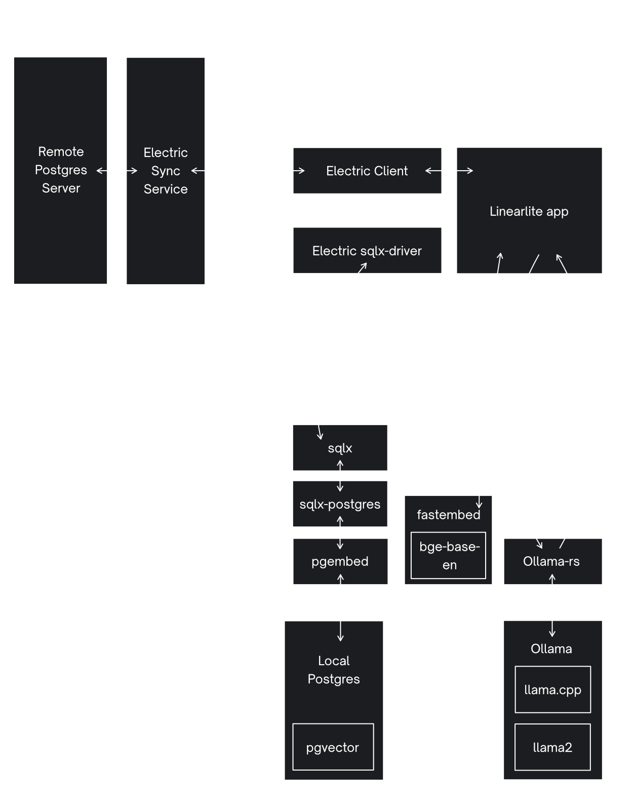 However, the primary ElectricSQL architecture is to sync between Postgres in the cloud and SQLite on the local device. So one approach we could see is to sync embeddings between pgvector in Postgres and sqlite-vss in SQLite. This is another experiment we're keen to do but we were intrigued by another possibility.