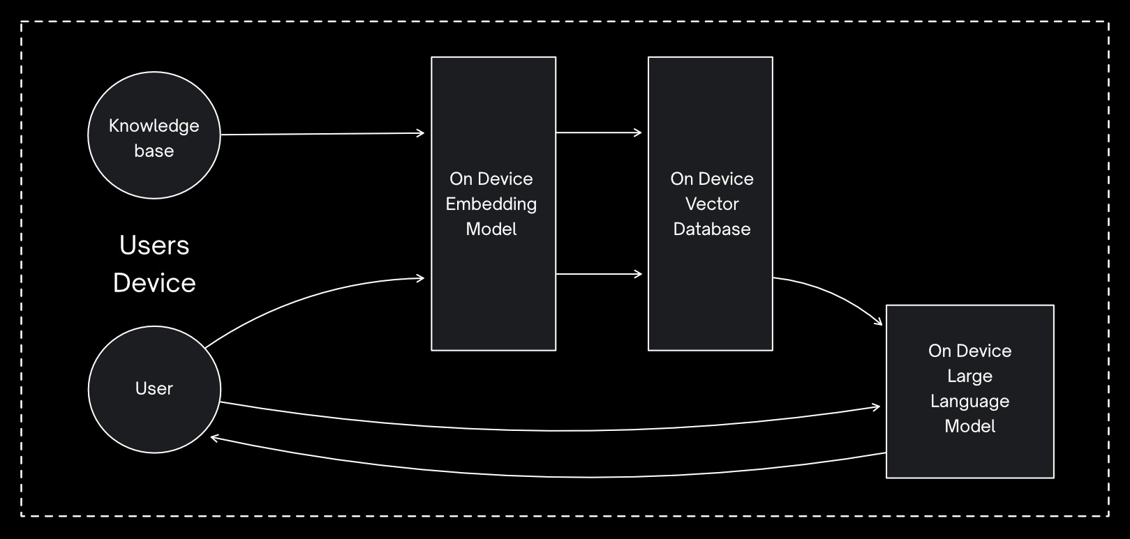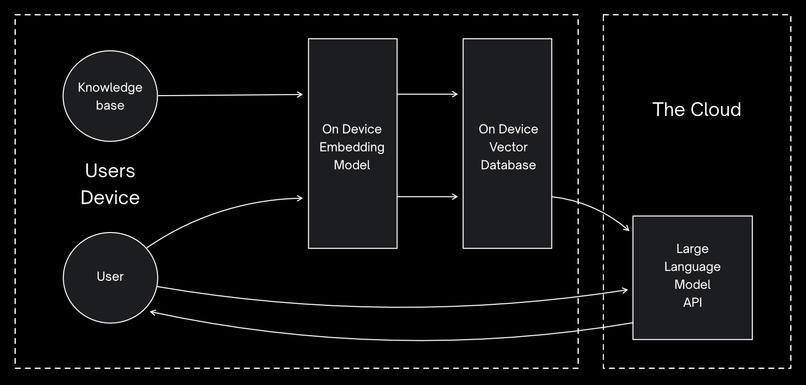 This is the architecture we were able to get to with this project. However, it's worth noting that, on lower-powered devices, such as less powerful mobile phones, it may not be possible to run the LLM locally due to the resources required, so it's also worth considering a hybrid approach.